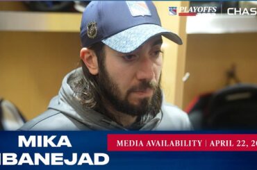 L’attaquant des Rangers de New York Mika Zibanejad répond aux questions des médias après le match du 22 avril contre…