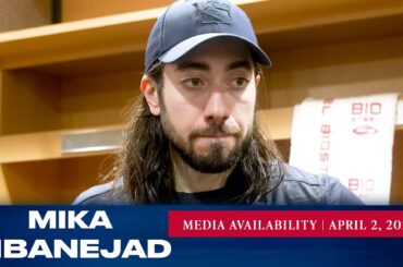 L’attaquant des Rangers de New York Mika Zibanejad répond aux questions des médias après le match du 2 avril contre…