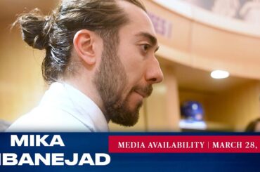 L’attaquant des Rangers de New York Mika Zibanejad répond aux questions des médias après le match du 28 mars contre…