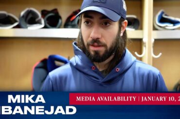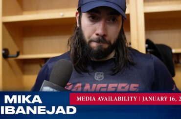 L’attaquant des Rangers de New York Mika Zibanejad répond aux questions des médias après le match du 16 janvier contre…