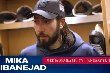 L’attaquant des Rangers de New York Mika Zibanejad répond aux questions des médias après le match du 19 janvier contre…