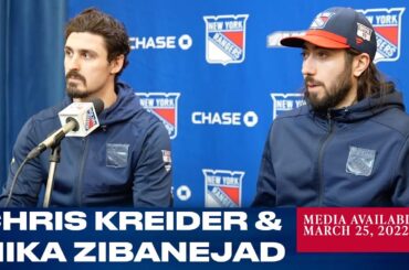 Les attaquants des Rangers de New York Chris Kreider et Mika Zibanejad répondent aux questions des médias après le match…