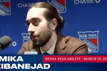 L’attaquant des Rangers de New York Mika Zibanejad répond aux questions des médias après le match du 19 mars contre…