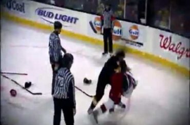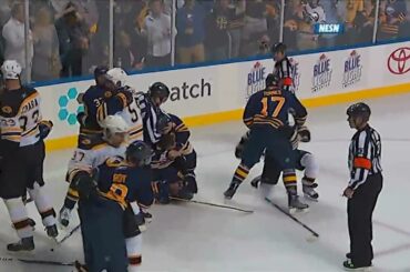 Freddy Meyer frappe Milan Lucic en hauteur, Andrew Ference lui saute dessus et une bagarre éclate. Lucic donne un coup…