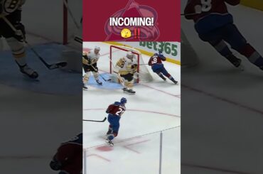 Le défenseur de l’Avalanche du Colorado Cale Makar se cache derrière le filet tandis que Nathan MacKinnon tire sur réception…