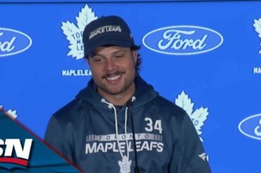 L’attaquant des Maple Leafs de Toronto Auston Matthews s’adresse aux médias avant le camp d’entraînement, parle de son prochain contrat,…