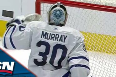 Regardez alors que le gardien de but des Maple Leafs de Toronto Matt Murray se tient absolument sur sa tête,…