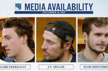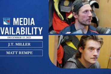Le capitaine des Rangers de New York, JT Miller, et l’attaquant Matt Rempe, parlent avec les médias après la défaite…