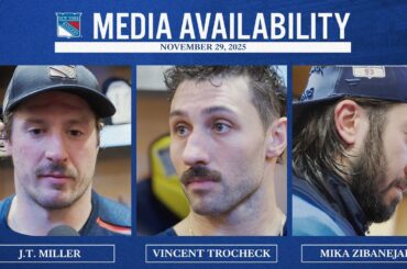 Le capitaine des Rangers de New York JT Miller, l’attaquant Vincent Trocheck et l’attaquant Mika Zibanejad parlent avec les médias…