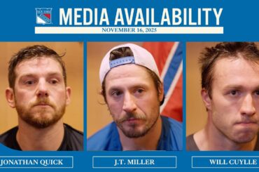 Le gardien de but des Rangers de New York Jonathan Quick, le capitaine JT Miller et l’attaquant Will Cuylle parlent…