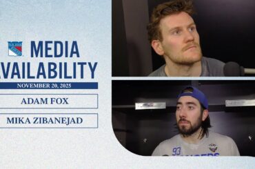 Le défenseur des Rangers de New York Adam Fox et l’attaquant Mika Zibanejad parlent avec les médias après la défaite…