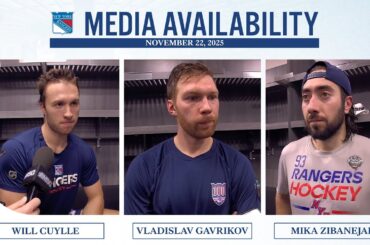 L’attaquant des Rangers de New York Will Cuylle, le défenseur Vladislav Gavrikov et l’attaquant Mika Zibanejad parlent avec les médias…