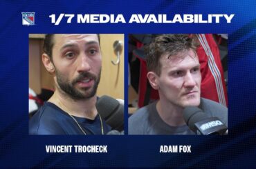 L’attaquant des Rangers de New York Vincent Trocheck et les défenseurs Adam Fox parlent avec les médias après la défaite…