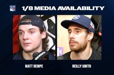 L’attaquant des Rangers de New York Matt Rempe discute de son jeu et l’attaquant Reilly Smith discute des préparatifs pour…