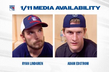 Le défenseur des Rangers de New York Ryan Lindgren discute de la poursuite de l’élan et l’attaquant Adam Edstrom discute…