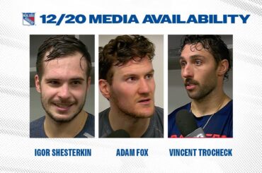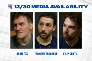 Les défenseurs des Rangers de New York Adam Fox et les attaquants Vincent Trocheck et Filip Chytil parlent avec les…
