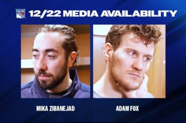 L’attaquant des Rangers de New York Mika Zibanejad et le défenseur Adam Fox parlent avec les médias après la défaite…