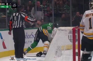Jonathan Aspirot contre Nathan Bastian des Bruins de Boston lors du match des Stars de Dallas le 20 janvier 2026.…