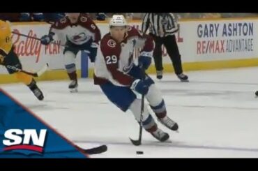 Regardez l’attaquant de l’Avalanche du Colorado, Nathan MacKinnon, donner la rondelle à lui-même pour sortir de la zone défensive, puis…