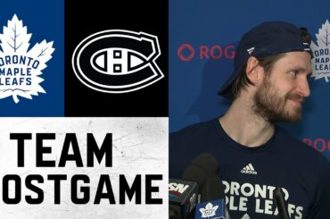 Les joueurs et l’entraîneur s’entretiennent avec les médias après la victoire 7-3 des Leafs contre les Canadiens de Montréal samedi.…