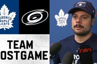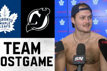 Les joueurs et l’entraîneur parlent avec les médias après la victoire 4-3 des Leafs en prolongation contre les Devils du…