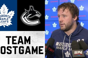 Les joueurs et l’entraîneur parlent avec les médias après la défaite 3-0 des Leafs contre les Canucks de Vancouver samedi.…