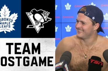 Les joueurs et l’entraîneur parlent avec les médias après la victoire 4-2 des Leafs contre les Penguins de Pittsburgh, samedi.…