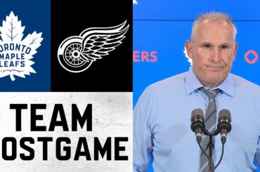 Les joueurs et l’entraîneur parlent avec les médias après la victoire 3-2 des Leafs contre les Red Wings de Détroit…
