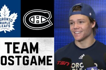 Les joueurs et l’entraîneur parlent avec les médias après la victoire 2-1 des Leafs contre les Canadiens de Montréal samedi.…