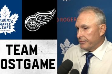 Les joueurs et l’entraîneur parlent avec les médias après la victoire 2-0 des Leafs contre les Red Wings de Détroit,…