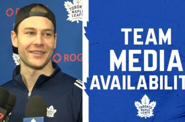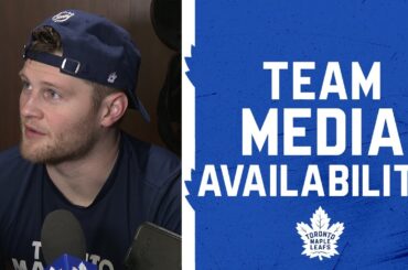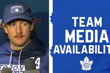 Nick Robertson, Steven Lorentz, Scott Laughton et l’entraîneur-chef Craig Berube s’adressent aux médias avant le match de ce soir contre…