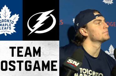 L’entraîneur-chef et les joueurs parlent avec les médias après la victoire 4-3 des Leafs en prolongation contre le Lightning de…