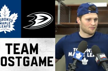 Les joueurs et l’entraîneur parlent avec les médias après la victoire des Leafs 3-2 contre les Ducks Anaheim dimanche ..…
