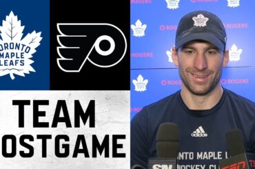 L’entraîneur-chef et les joueurs parlent avec les médias après la victoire 7-2 des Leafs contre les Flyers de Philadelphie mardi.…