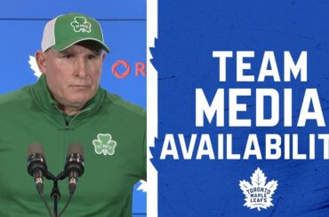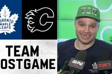 Les joueurs et l’entraîneur parlent avec les médias après la victoire des Leafs 6-2 sur les Flames de Calgary lundi.…