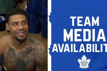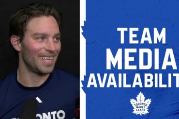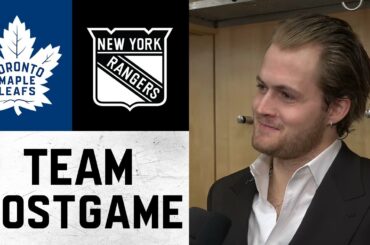 Les joueurs et l’entraîneur parlent avec les médias après la victoire des Leafs 3-2 contre les Rangers de New York…