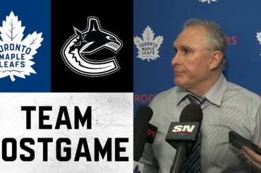 L’entraîneur-chef et les joueurs parlent avec les médias après la défaite des Leafs 2-1 contre les Canucks de Vancouver samedi.…