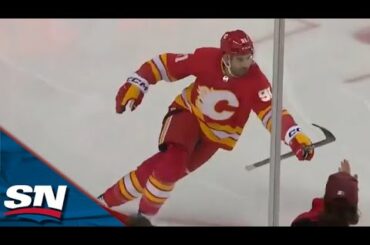 Regardez l’ailier des Flames de Calgary Jakob Pelletier battre son homme sur place pour terminer une belle passe de Nazem…