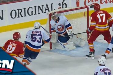 Regardez l’attaquant des Flames de Calgary Nazem Kadri lancer la rondelle dans le coin supérieur du gardien des Islanders de…