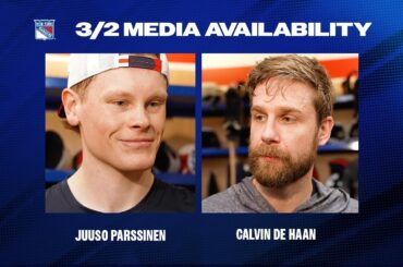 L’attaquant des Rangers de New York Juuso Parsinen et le défenseur Calvin de Haan discutent de l’arrivée à New York…