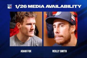 Le défenseur des Rangers de New York Adam Fox et l’attaquant Reilly Smith parlent avec les médias après la défaite…