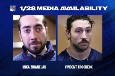Les attaquants des Rangers de New York Mika Zibanejad et Vincent Trocheck parlent avec les médias après la défaite de…