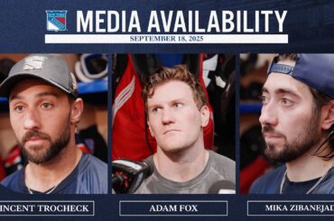 New York Rangers Forwards Vincent Trocheck, JT Miller et Mika Zibanejad parlent avec les médias après la défaite de la…