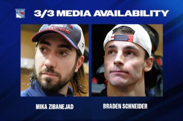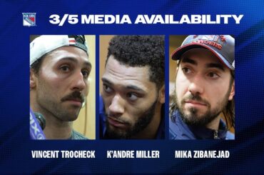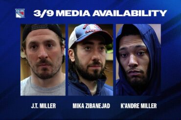 Les Rangers de New York Forwards JT Miller et Mika Zibanejad et le défenseur K’andre Miller parlent avec les médias…