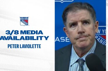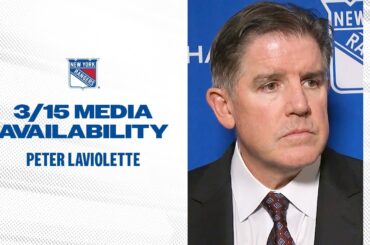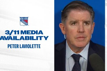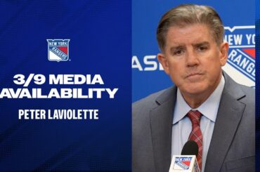 L’entraîneur-chef des New York Rangers, Peter Laviolette, s’exprime avec les médias après la défaite de l’équipe contre les Blue Jackets…