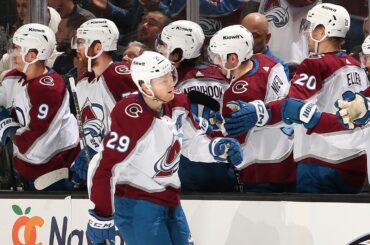 L’attaquant de l’Avalanche Nathan Mackinnon va travailler sur Scott Harrington avant de se retourner et de déchirer un tir de…