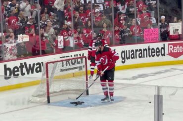 Jack Hughes montre LES COMPÉTENCES lors des échauffements au Prudential Center avant les demi-finales de la Conférence Est du match…