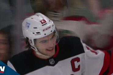 Regardez le capitaine du New Jersey Devils Nico Hischier frappe le dos du filet trois fois contre le Wild du…
