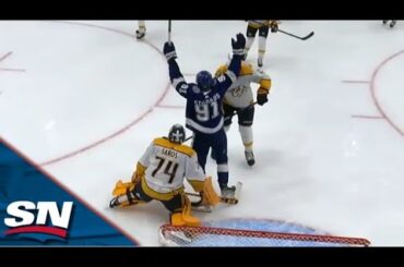 L’attaquant du Lightning Nikita Kucherov lance un tir sur réception contre Juuse Saros pour marquer le premier but de la…