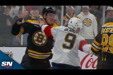 Regardez Nikita Zadorov de Boston Bruins et Sam Bennett de Florida Panthers déposer les gants dans un échange de front…